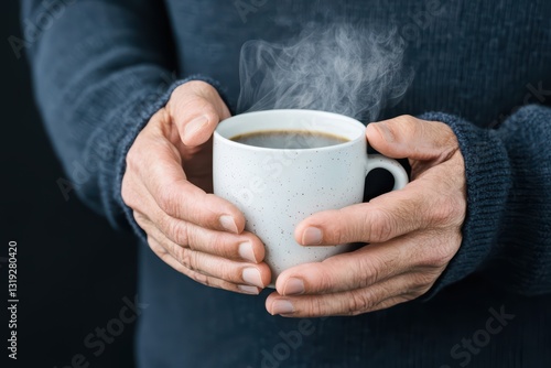 Man Holding Steaming Hot Coffee Cup with Warm Hands in Cozy Sweater Against Dark Background
