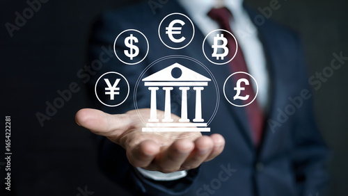 Man holds financial symbols around a bank, symbolizing global currency exchange