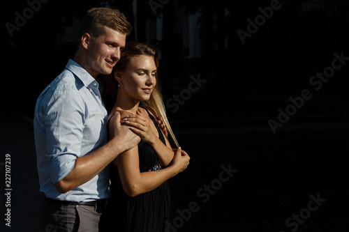 man hugging girl on the street, hugging her, attracted to each other. girl in a black dress. man hugs from behind the woman and kisses on the forehead.the couple is standing against a dark background