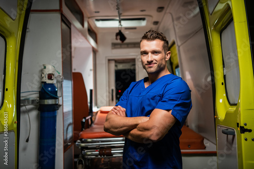 Man in a medical uniform looking at the camera and smiling, ambulance car in the background.