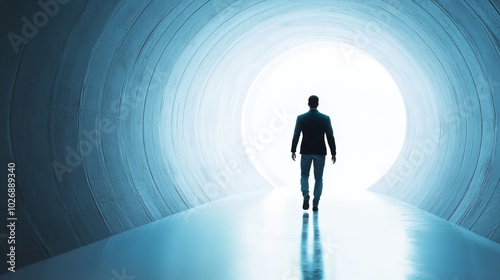 man in a suit walks through a sleek, futuristic tunnel toward a bright light, symbolizing progress, innovation, and new opportunities.