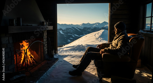 Man in armchair by fireplace looks out at snowy mountains through open doorway in cabin setting