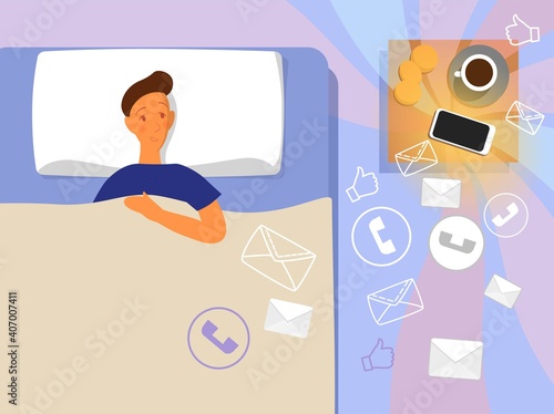 Man in bed with a phone. Modern life with a smartphone. Distract from sleep. Annoying notifications. Cartoon style