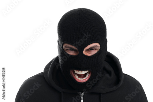 Man in black balaclava screaming on white background