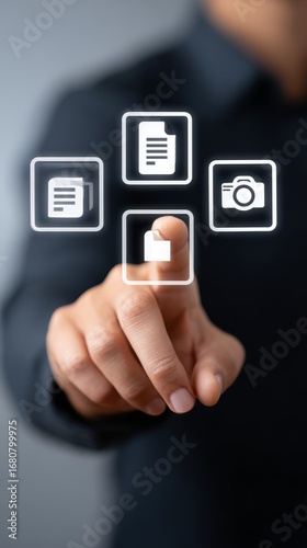 Man in black shirt activates futuristic interface, a glimpse into digital interaction and technological advancement.