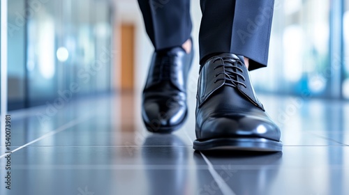 Man in business attire walks confidently on a sleek tile floor in an office environment, showcasing polished shoes