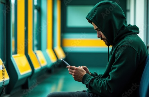 Man in dark hoodie using smartphone on public transportation with yellow and green interior elements