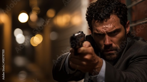 Man in dark suit stands tense and alert in dimly lit alleyway, gun in hand, prepared to defend against unseen threat, intense focus on impending danger.