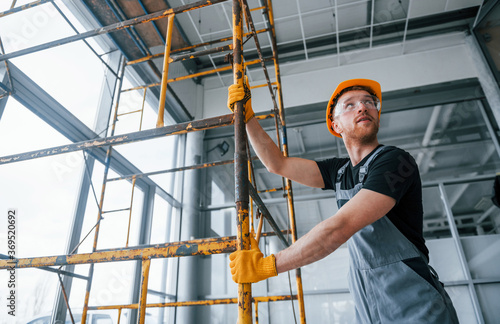 Man in grey uniform works with construction indoors in modern big office at daytime