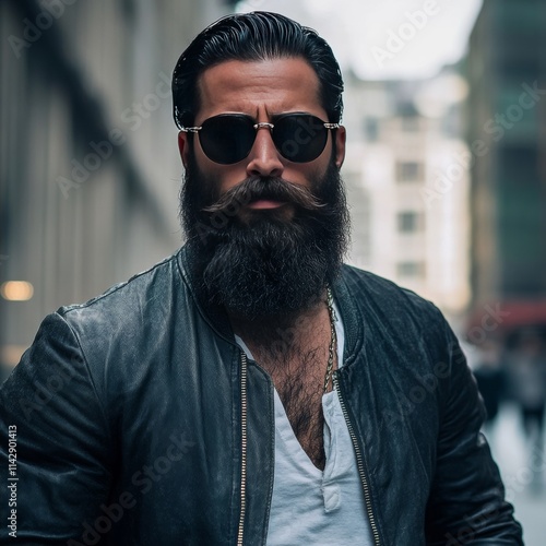 Man in jacket and sunglasses walks down street with beard.