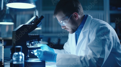 Man in lab coat is looking through microscope