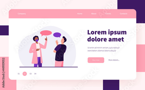 Man in mask talking with guy without mask. Discussion, speech bubble, virus flat vector illustration. Pandemic and protection concept for banner, website design or landing web page