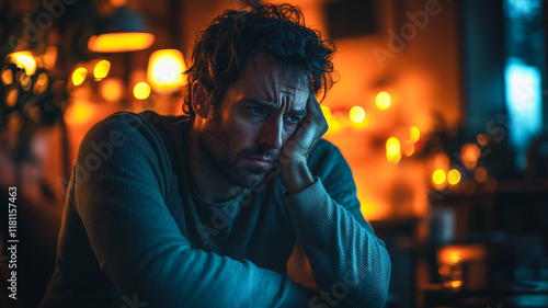 Man in Shadows: A man sits alone in a dimly lit cafe, his face etched with worry and contemplation. The warm glow of the lights cast long shadows, amplifying the sense of loneliness and introspection.