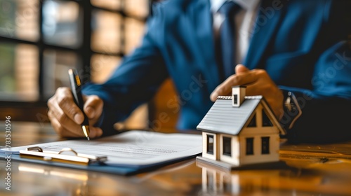 Man in Suit Finalizing Deal with a Model House on the Table. Real Estate Concept Represented by Miniature Home. Businessman Secures Property Investment. AI