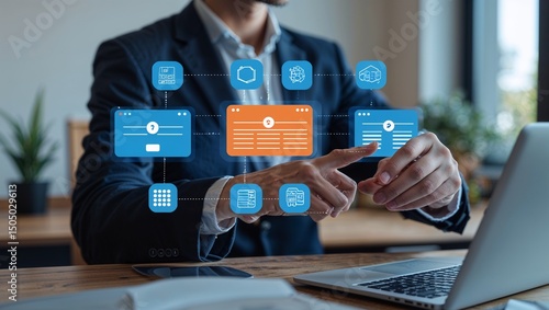 Man in suit interacting with digital interface and laptop on desk at the office space area view