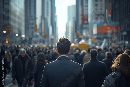 Man in Suit Walking in a Crowded City Street with Sunlit Buildings