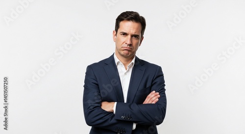 Man in suit with arms crossed and a displeased expression against a plain white background looking forward