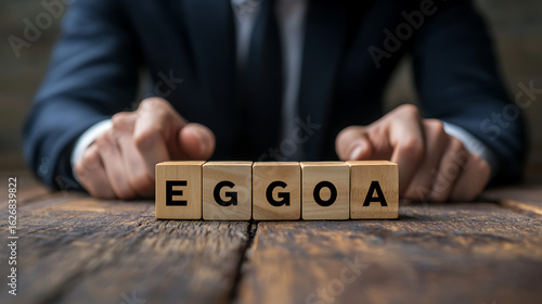 Man in suit with wooden blocks spelling eggoa on a wooden surface