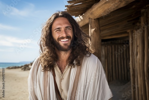 Man in white robe smiling near wooden structure on beach