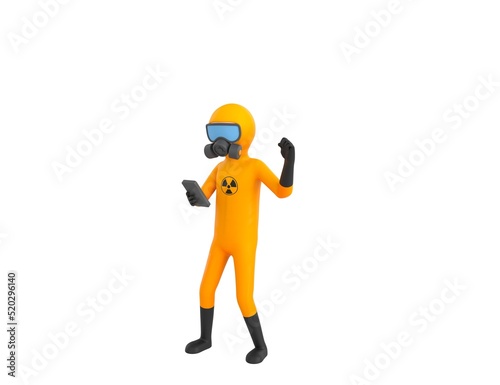 Man in Yellow Hazmat Suit character looking his phone and doing winner gesture with fists up in 3d rendering.