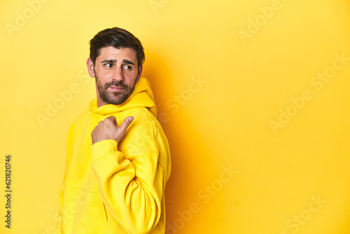 Man in yellow hoodie, monochrome studio backdrop points with thumb finger away, laughing and carefree.