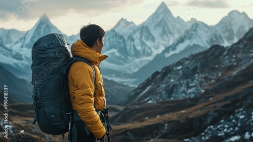 Man in yellow jacket on hilltop, overlooking sharp mountain peaks and expansive valleys, bathed in warm late afternoon light.