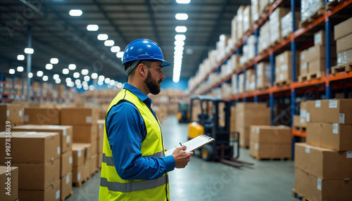 Man inspecting boxes in a busy logistics center, highlighting efficiency in inventory management.