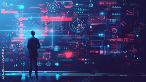 Man Interacting with Futuristic Digital Interface, Digital Art, Cyberpunk, Neon, Technology , digital art, interface