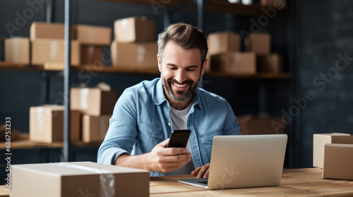 Man is smiling and using a laptop among shelves stocked with cardboard boxes in what appears to be a small business warehouse setting.