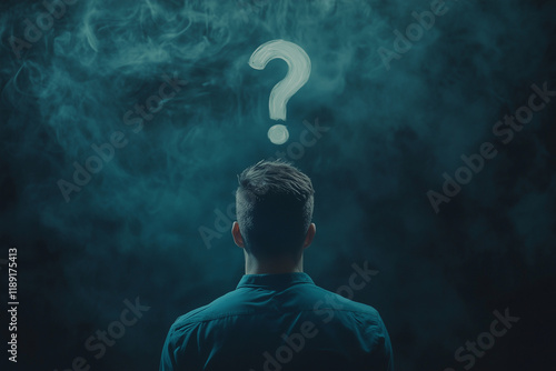 man is standing in front of a wall of smoke with a question mark on his head. Concept of confusion and uncertainty, as the man is lost or unsure of what to do