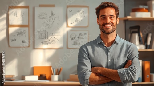 Man is standing in front of a white wall with drawings on it. He is smiling and has his arms crossed. man talking to the camera, smiling, caucasian. mid-shot, creative office environment, warm colors.