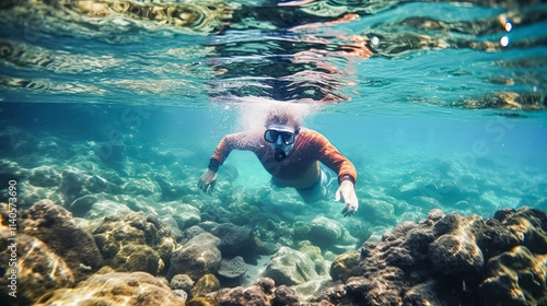 Man is swimming in the ocean with a lot of fish around him. The fish are scattered all over the water, and the man is surrounded by them. The scene is peaceful and serene