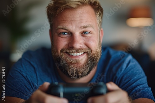 Man Joyfully Plays Video Games at Home, Enjoying the Thrilling Experience.