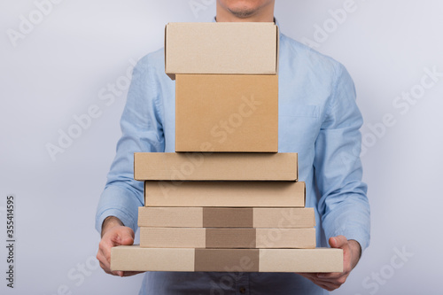 Man keep a lot of cardboard boxes. Express delivery concept. Delivery of parcels to house.