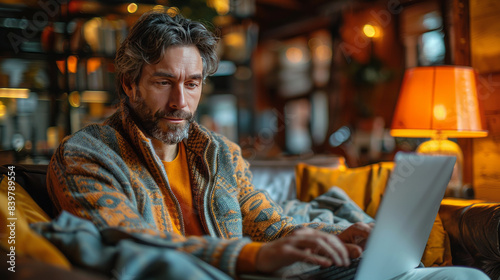 Man knitting at home, following an online tutorial, enjoying a relaxing leisure activity on the sofa.generative ai