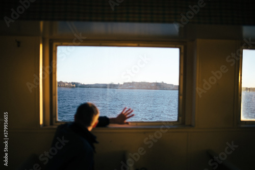 Man looks out the window of a commuter ferry