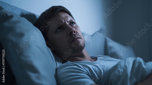 Man lying in bed, looking contemplative and awake at night, surrounded by soft pillows and blankets. dim lighting creates serene atmosphere, evoking feelings of introspection and calmness