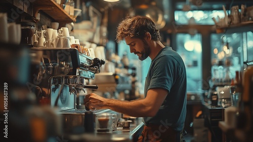 Man Making Coffee in a Modern Coffee Shop Studio, Morning Routine, European