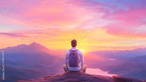 Man meditates on mountaintop at sunset, overlooking valley . Generative AI
