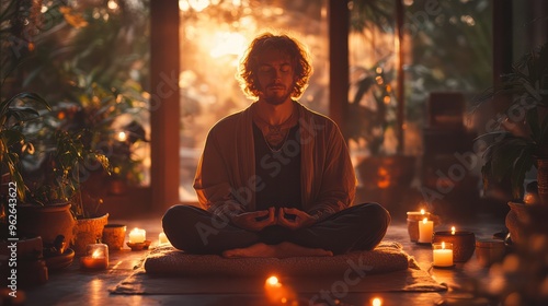 Man meditating in a quiet corner of his home, sitting cross-legged on a cushion, candles and soft ambient lighting,