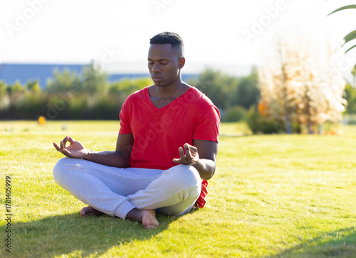 Man meditating on grass in backyard, enjoying peaceful outdoor relaxation