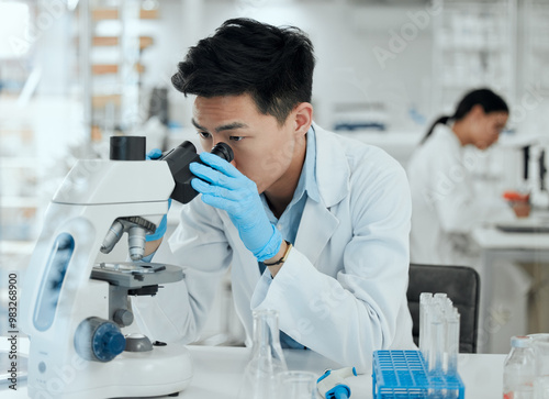 Man, microscope and research in lab for science, observation and experiment results. Scientist, tech and study at table for medicine engineering, pharmaceutical development and healthcare innovation