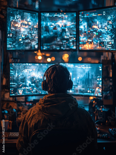 Man Playing Video Games on Multiple Monitors
