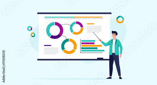 Man Presenting Financial Data on a Whiteboard with Charts and Graphs.