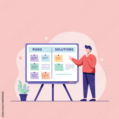 Man presenting risks and solutions on whiteboard in office, pointing and thinking about business strategy on pastel pink backdrop.
