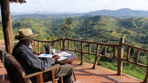 Man Relaxing on Terrace Overlooking Lush Mountainous Landscape and Forest View