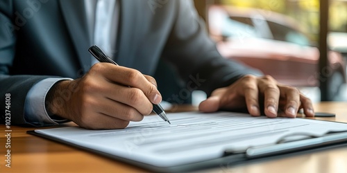 Man signing car insurance document or lease paper. Writing signature on contract or agreement. car on desk