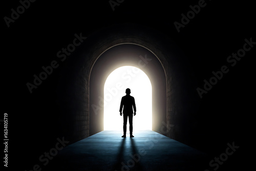 Man silhouettes against bright light in arched tunnel, facing future challenges