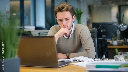 Man sits in office,looks confused or perplexed,office background,question mark,copy space.