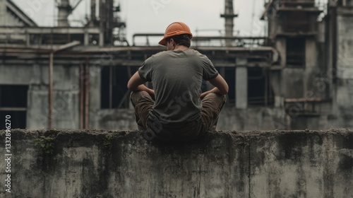 Man sits on wall, back to camera, facing abandoned industrial site.